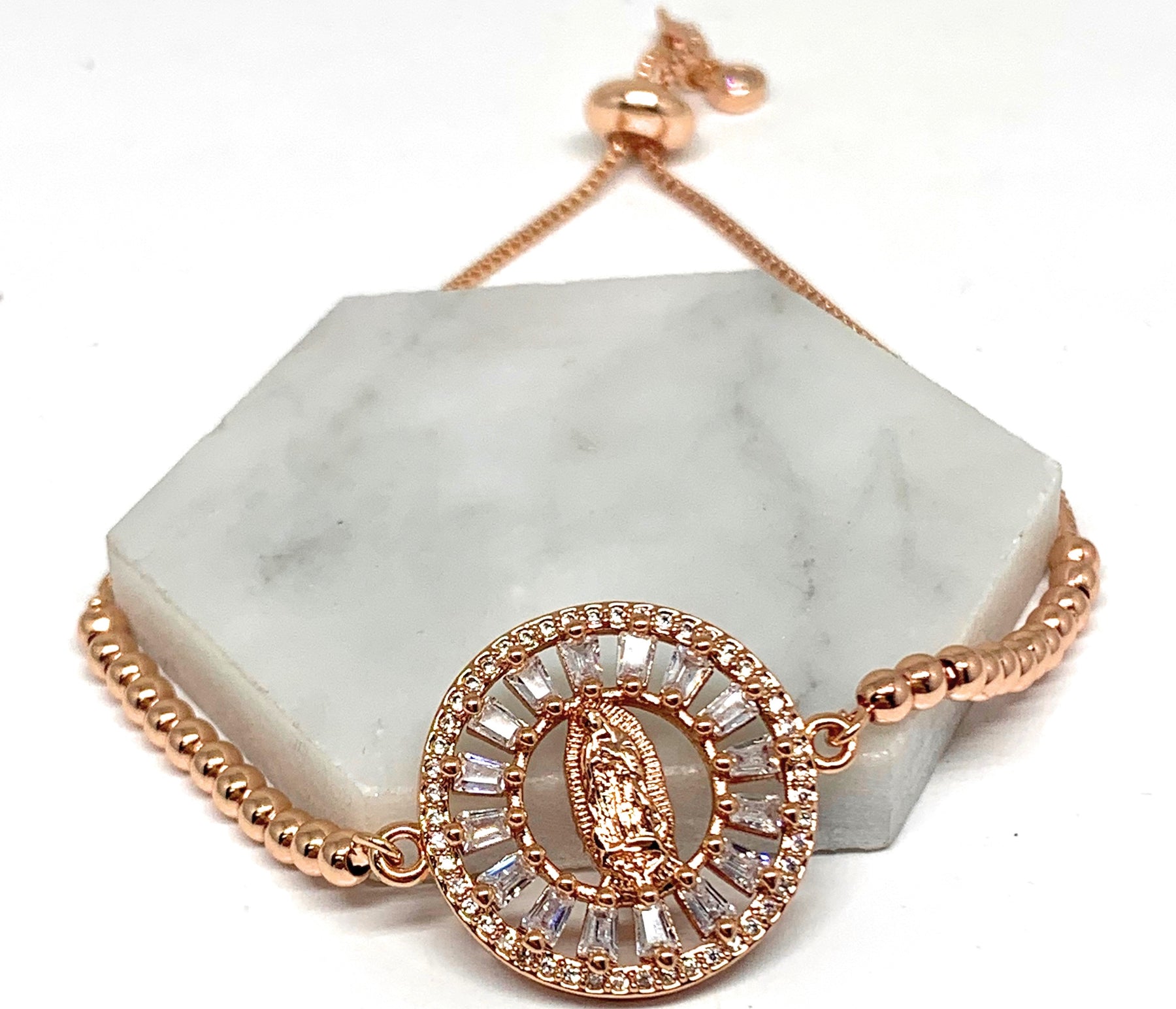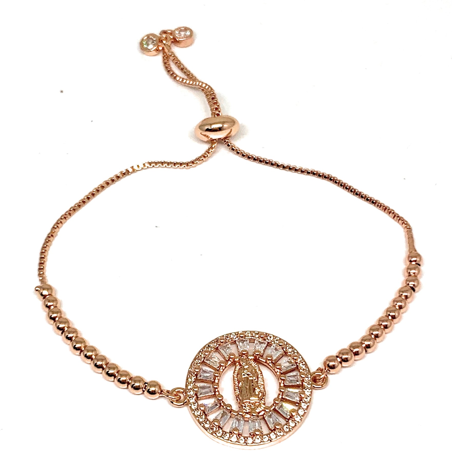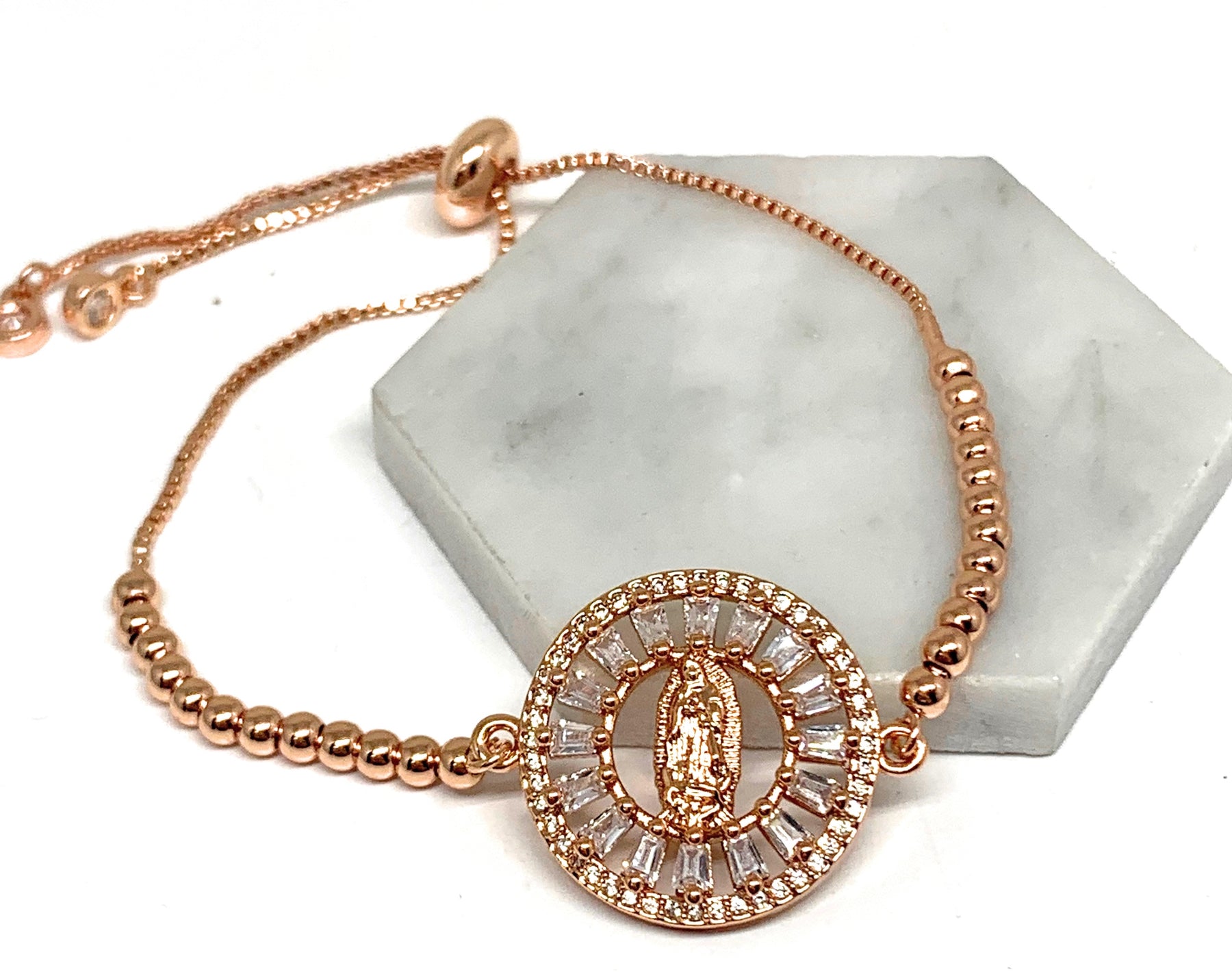 Gold Plated Virgin Mary Rose CZ Bracelet Virgen De Guadalupe Pulsera 8" Adjustable