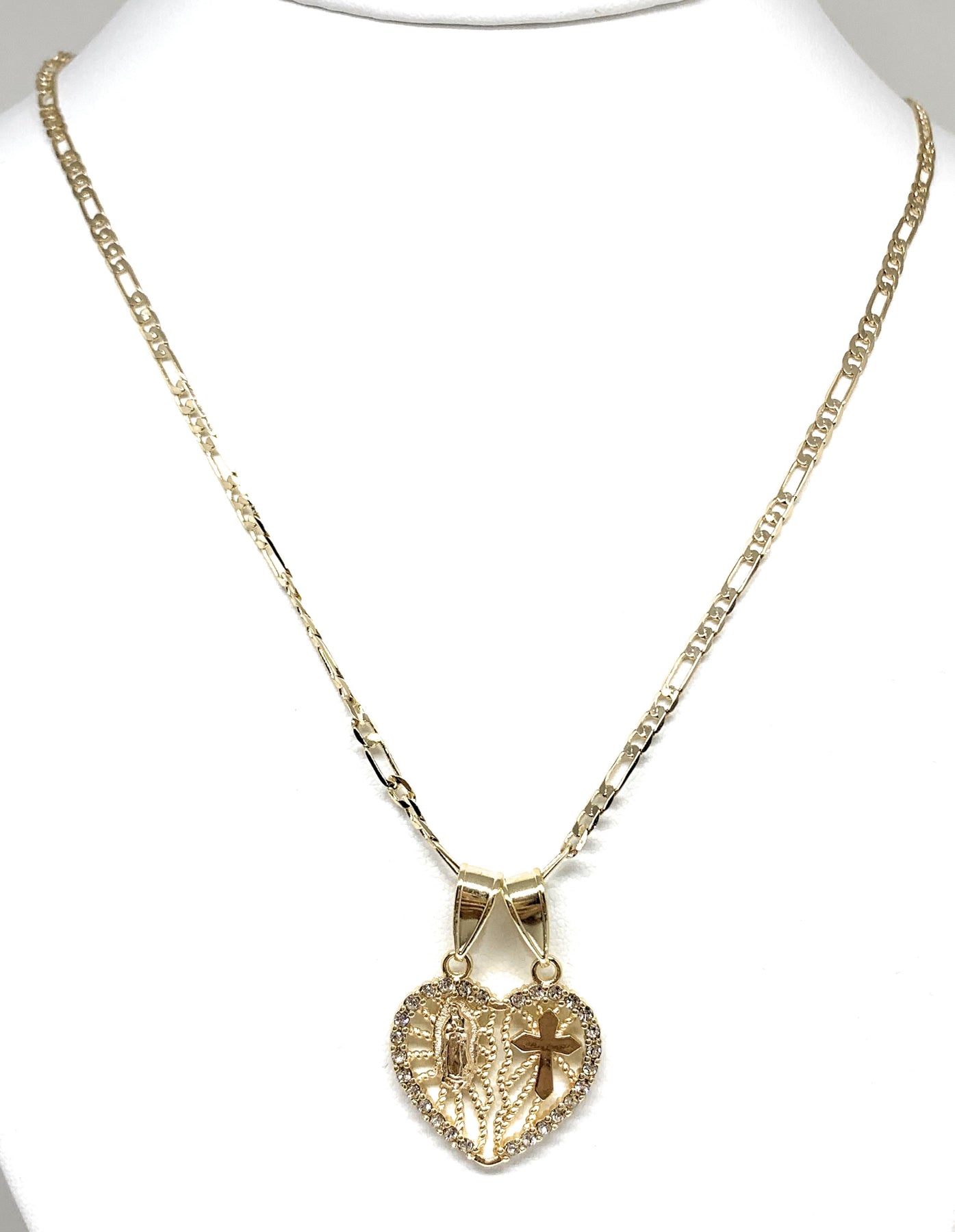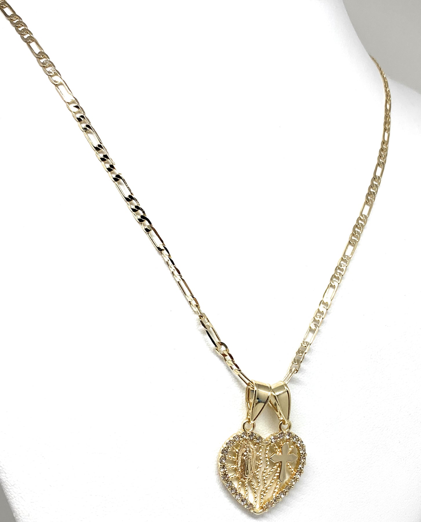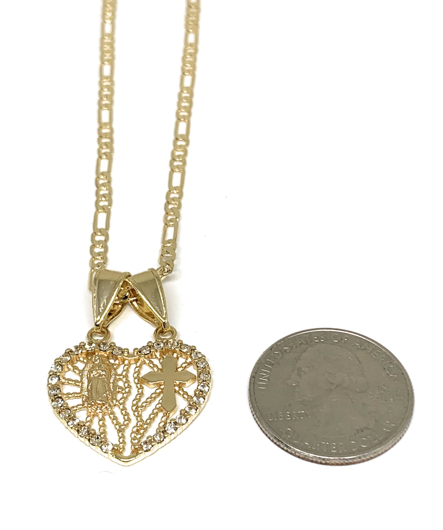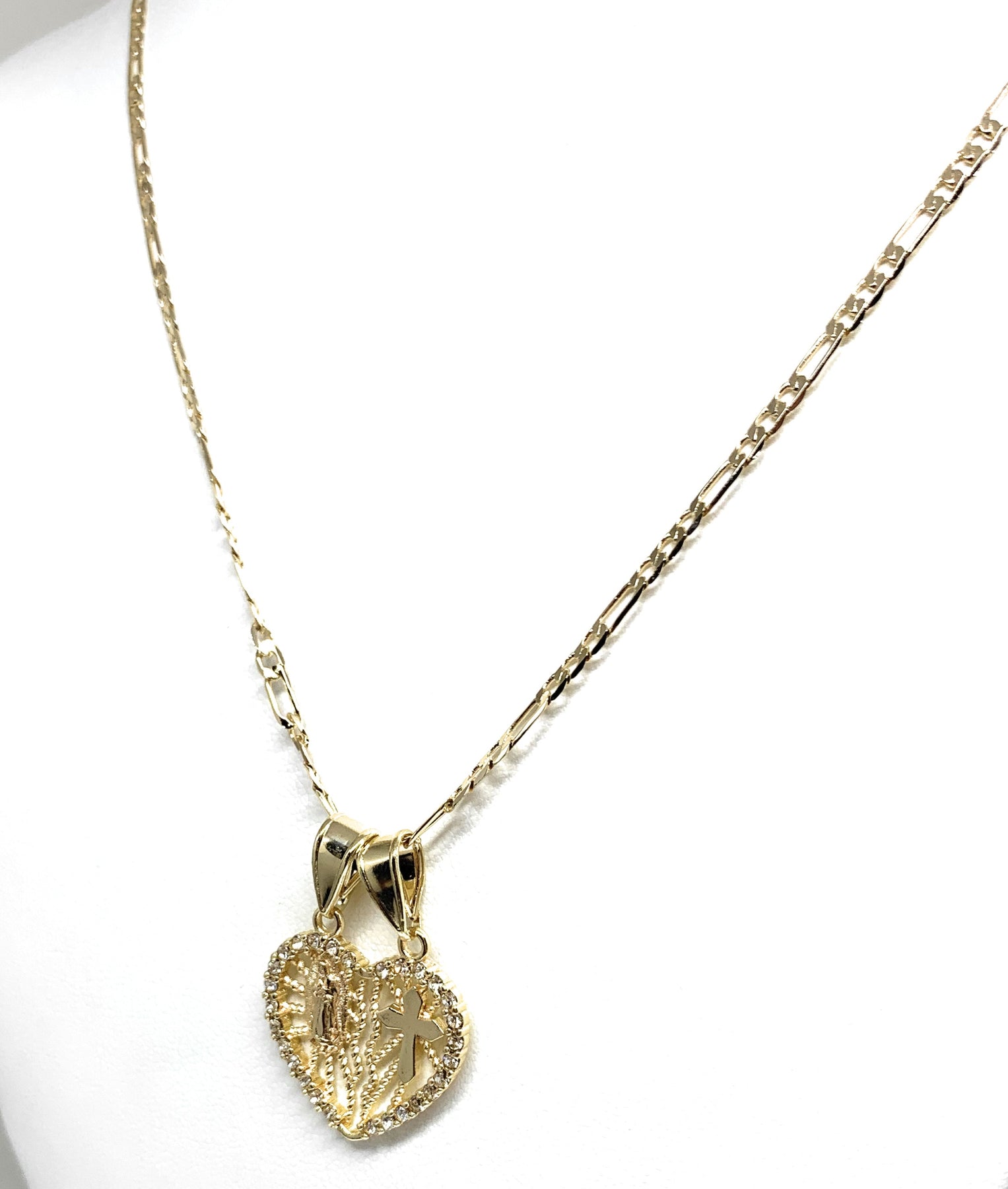 Gold Plated Yellow Virgin Mary Heart & Cross Heart Split Pendant Necklace 24" Virgen de Guadalupe
