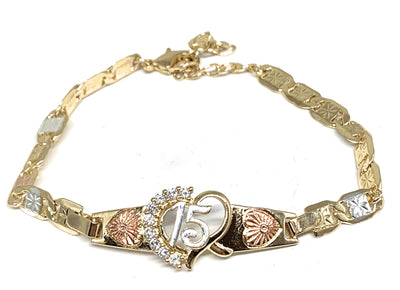 Tri-Color 15 Años Bracelet Quinceañera Pulsera Tres Colores Oro Laminado 8"