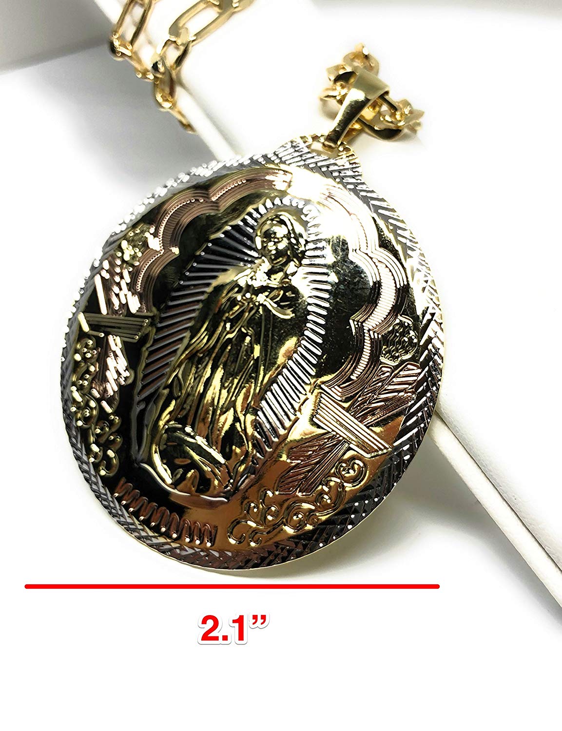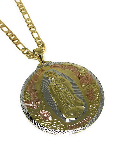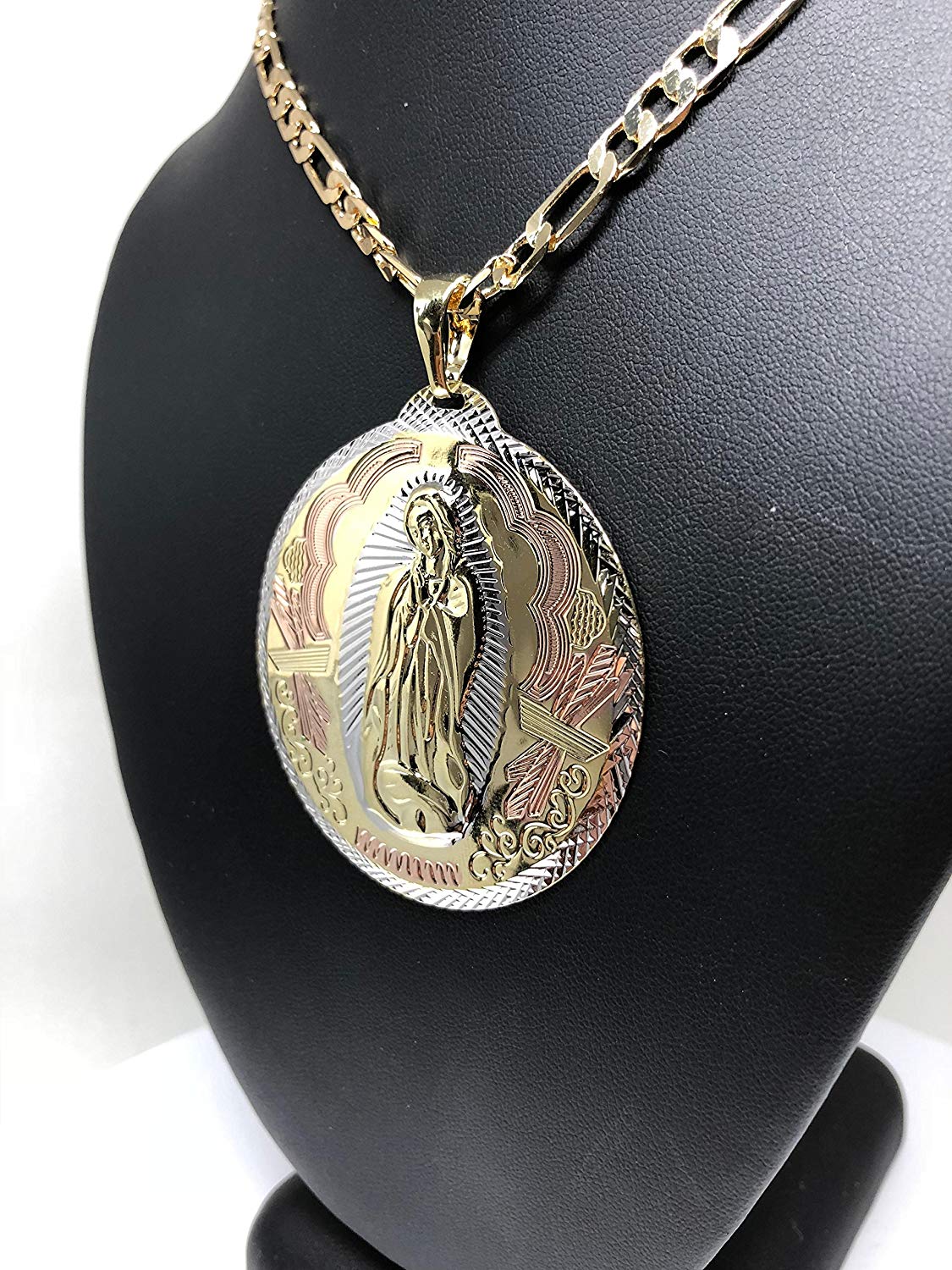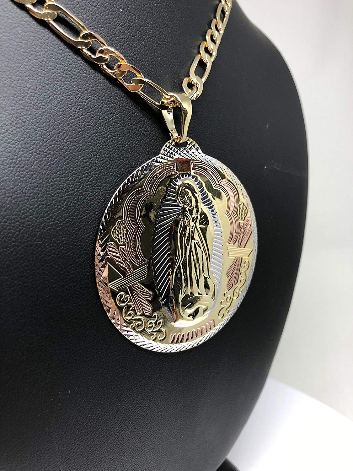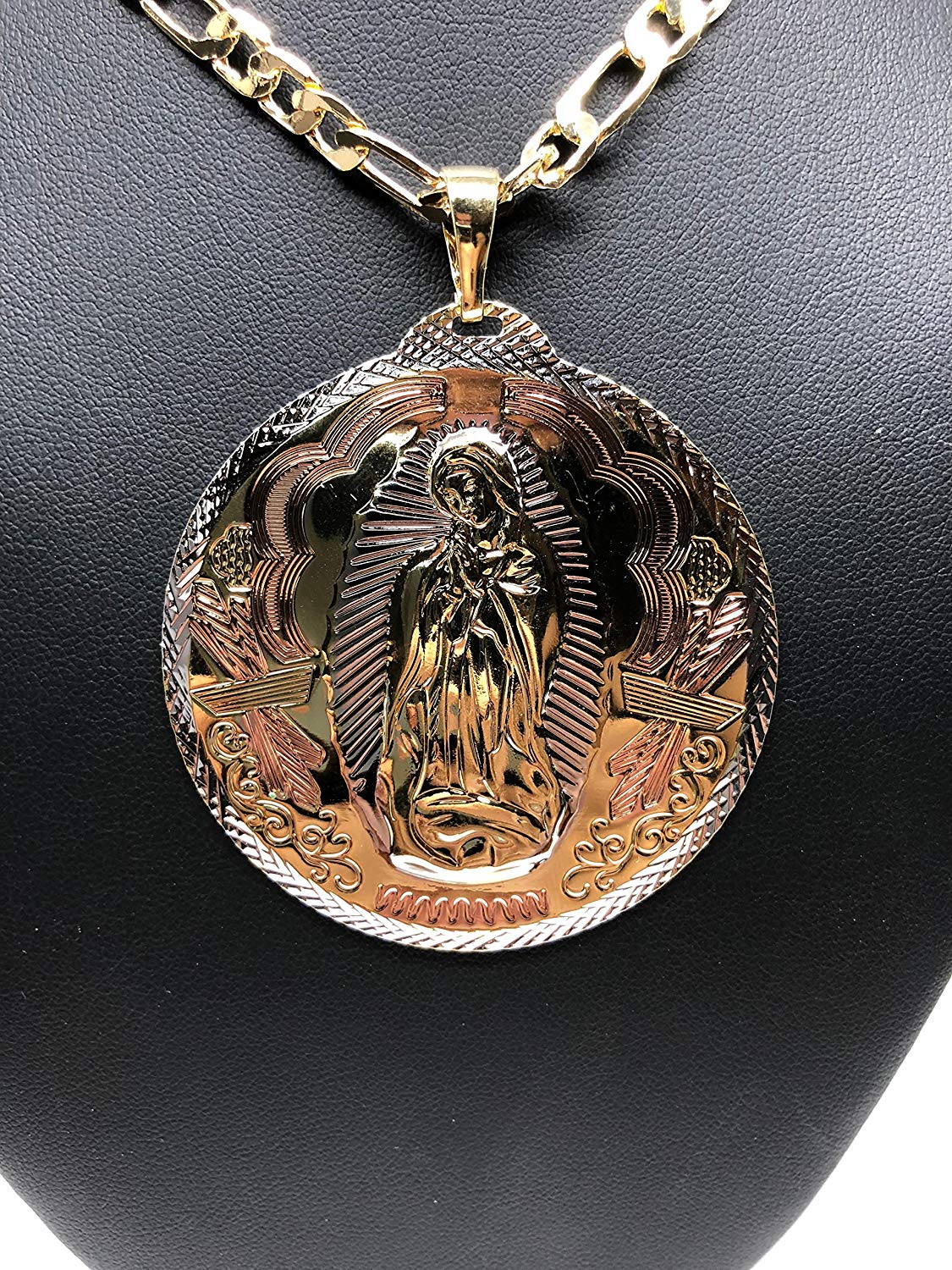Gold Plated Big XL Tri-Color Virgin Mary Pendant / Virgen Guadalupe Tres Colores XL Grande Medalla Pendant Necklace Chain 26"